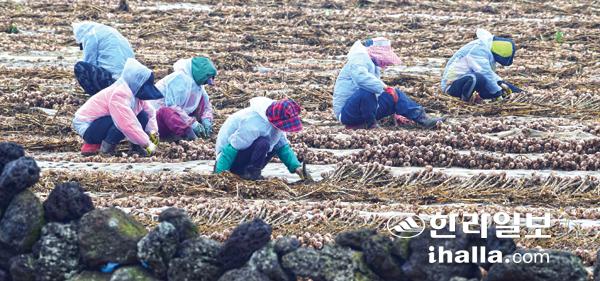 17일 서귀포시 대정읍 영락리 한 농경지에서 농민들이 비옷을 입고 마늘 수확작업을 하고 있다. 강희만기자