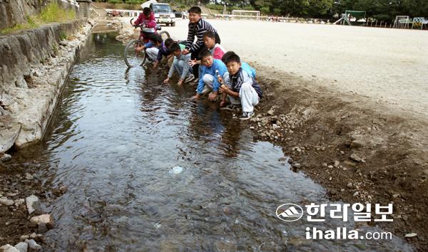 1999년 가을 비가 많이 내리면서 위미초등학교 운동장에 물이 넘쳐나자 어린이들이 신기한 듯 물가에서 놀고 있다.