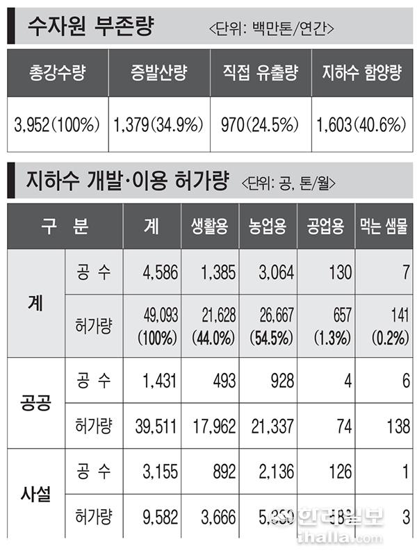 제주 연간 강수량 39억5200만t 중 40% 지하수로 함양질산성 질소 등으로 오염돼 관정 수원지 폐쇄 증가 추세비닐하우스 불투수층 증가 함양량 저하로 고갈 위기 가속