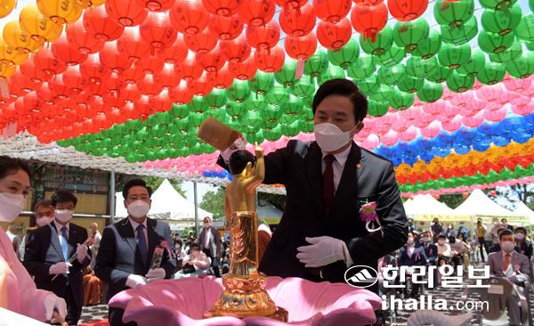 원희룡 제주도지사가 19일 관음사 봉축 법요식에 참석해 관불 의식을 하고 있다. 강희만기자
