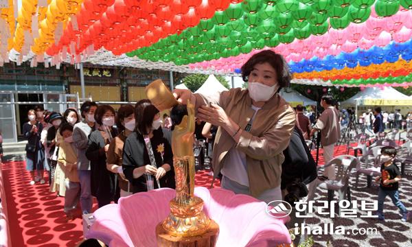 부처님 오신 날인 19일 대한불교조계종 제23교구 본사 관음사에서 열린 봉축 법요식 참석자들이 이 세상에 부처가 오신 뜻을 새기며 관불 의식을 하고 있다. 강희만기자