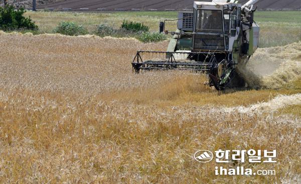19일 제주시 한경면 고산리 한 보리밭에서 농민이 콤바인을 이용해 보리를 수확하고 있다. 강희만기자