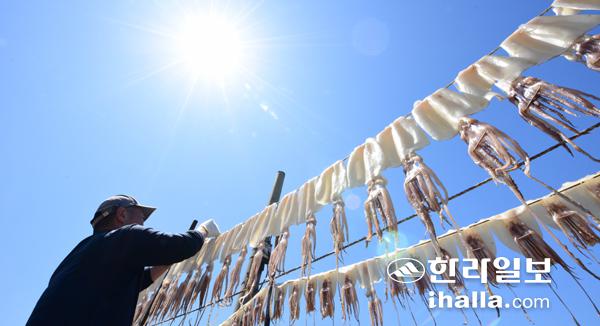18일 제주시 한경면 자구네포구 인근에서 어민들이 오징어를 말리고 있다. 이상국기자