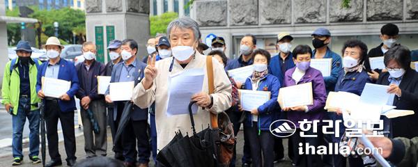 20일 오전 제주지법 정문에서 제주4·3도민연대 주최로 제4차 일반재판 4·3 피해자 재심청구 기자회견이 열리고 있다. 연합뉴스