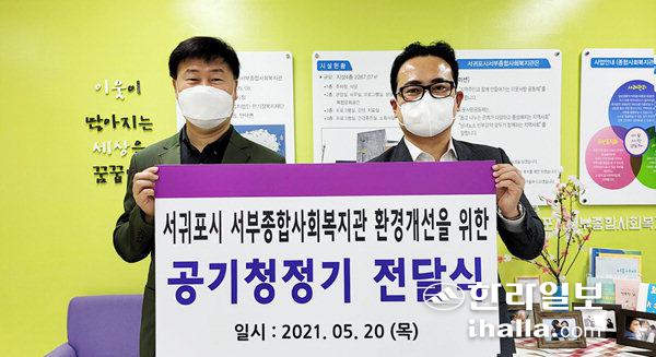 신세계사이먼(대표 조창현)은 20일 서귀포시 서부종합 사회복지관(관장 석건) 환경 개선을 위한 물품 지원식을 진행하고 복지관 실내 환경 개선을 위해 공기청정기 5대를 전달했다.
