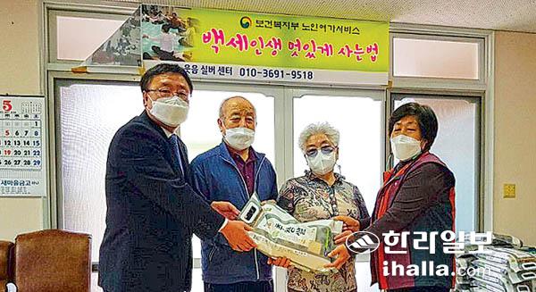 제주시 오라3동 현기덕 마을회장은 최근 코로나19로 경로당에서 식사 제공이 이뤄지지 않아 어려움을 겪고 있는 어르신들을 위해 자택에서 간단한 식사를 할 수 있도록 금일봉을 전달하고 대화의 시간을 가졌다.