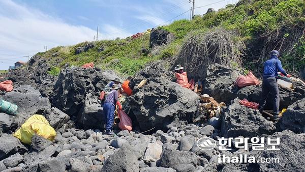 21일 제주시 애월읍 애월해안로에서 바다지킴이들이 바위 사이에 널려있는 쓰레기들을 분주하게 치우고 있다. 사진=강민성기자