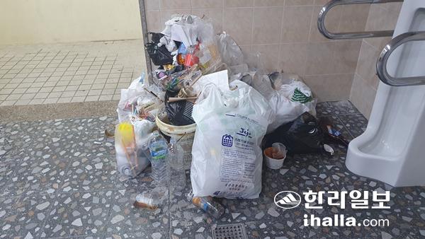 22일 제주시 한림읍 협재해수욕장 주차장 화장실에 쓰레기가 쌓여있다.