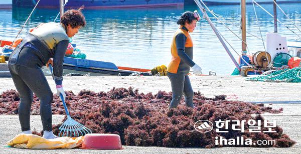 23일 제주시 구좌읍 종달리 포구에서 해녀들이 채취한 우뭇가사리를 말리고 있다. 이상국기자