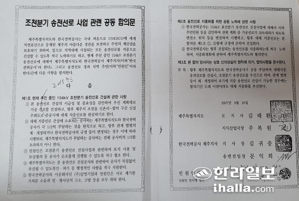 김태환 제주특별자치도지사와 김귀중 한국전력공사 제주지사장, 이재광 조천읍 민원인 대표는 지난 2007년 9월 20일 제주의 아름다운 경관과 주민의 재산권을 보호하기 위해 조천분기 송전선로 사업 공동 합의문을 작성, 서명했다.