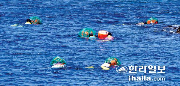 24일 서귀포시 대정읍 하모리 바닷가에서 해녀들이 물질작업을 위해 헤엄치고 있다. 강희만기자