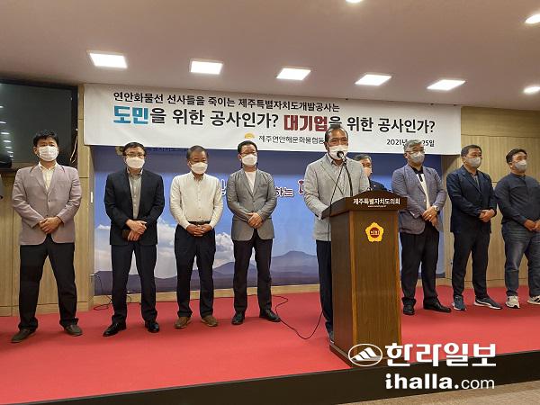 제주연안해운화물협동조합(이하 협동조합)은 25일 제주도의회 도민의 방에서 기자회견을 열고 "제주도와 도의회는 삼다수 도외 물류운영의 문제점을 정확히 파악, 해결에 나서라"고 밝혔다.