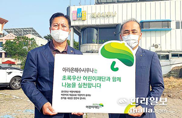 제주시 이호동에 위치한 아라온 해수사우나(대표 장승남)는 25일 초록우산 어린이재단 제주지역본부(본부장 김희석)·제주후원회(회장 장행우)가 진행는 나눔 릴레이캠페인에 동참해 매월 수익금 일부를 기부하기로 약속하고 나눔현판을 전달하는 시간을 가졌다.