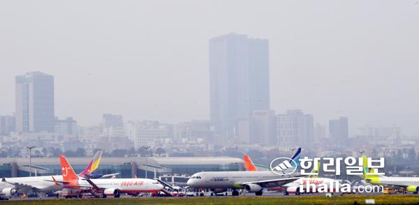 미세먼지 매우나쁨을 보인 25일 제주국제공항 너머로 신제주 시가지가 희미하게 보이고 있다. 강희만기자
