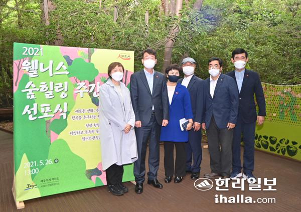 서귀포시는 26일 서귀포 치유의숲에서 숲힐링 웰니스 산림관광 활성화와 특화된 산림관광서비스 제공으로 관광자원과 연계한 지역경제 활성화를 위해 '2021 웰니스 숲힐링 주간의 첫 행사로 숲힐링 선포식을 가졌다.