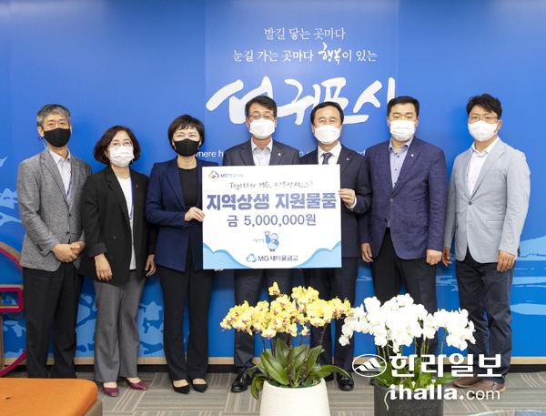 제주도 내 MG새마을금고와 새마을금고중앙회 제주지역본부는 지난 25일 '지역상생의 날'(창립일)을 맞아 서귀포시청 시장실을 방문해 어려운 이웃을 위해 써달라며 비누, 티슈, 간장 등 500만원 상당의 물품을 기탁했다.