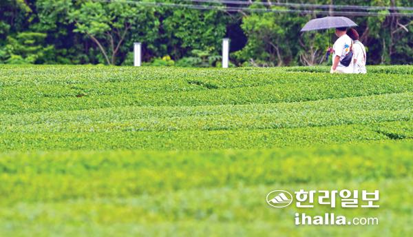 26일 서귀포시 안덕면 오설록 녹차밭을 찾은 관광객이 우산을 쓰고 산책하고 있다. 연합뉴스