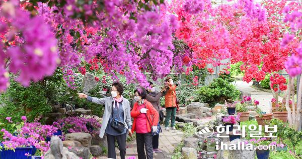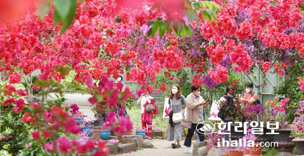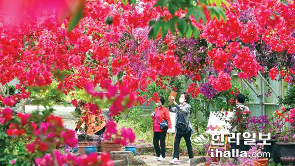 26일 제주시 한림공원 부겐빌레아 축제현장을 찾은 관광객들이 형형색색의 아름다운 꽃들을 배경으로 기념사진을 찍고 있다.