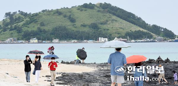 비가 내린 26일 제주시 한림읍 협재해수욕장을 찾은 관광객들이 우산을 쓴채 해변을 거닐며 비양도를 품은 청정 제주 바다를 만끽하고 있다. 이상국기자