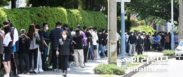 26일 제주지역 코로나19 확진자가 26명 발생하고 제주시청 인근 대학로 주점에서 확진자가 무더기로 발생하며 27일 제주보건소는 진단검사를 기다리는 시민들로 대기줄이 길게 늘어섰다. 이상국기자