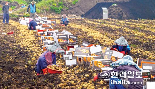 28일 서귀포시 대정읍 하모리 한 농경지에서 농민들이 감자 수확 작업을 하고 있다. 강희만기자