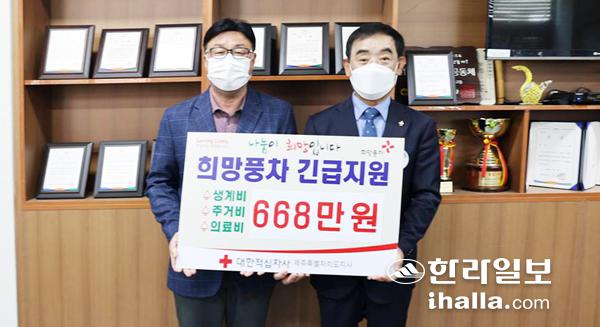 대한적십자사제주특별자치도지사(회장 오홍식)는 최근 이도2동 관내 위가가정에 생계비, 주거비, 의료비 등 총 668만원을 지원했다.