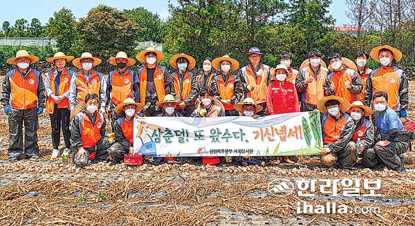 이날 봉사단원 40여명은 제주시 조천읍 관내 마늘 농가를 찾아 2000여평의 밭에서 마을 수확으로 구슬땀을 흘리며 '삼춘덜! 또 왔수다. 기신넵서!'라는 응원의 메시지를 전달했다.