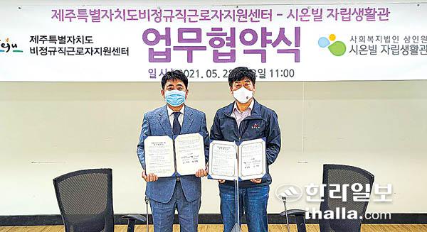 시온빌(관장 변성환)은 지난 28일 제주특별자치도근로자종합복지관 3층 중회의실에서 제주도 비정규직근로자지원센터(센터장 조순호)와 제주지역 보호종료아동들에게 양질의 서비스를 지원하기 위한 업무 협약식을 가졌다.