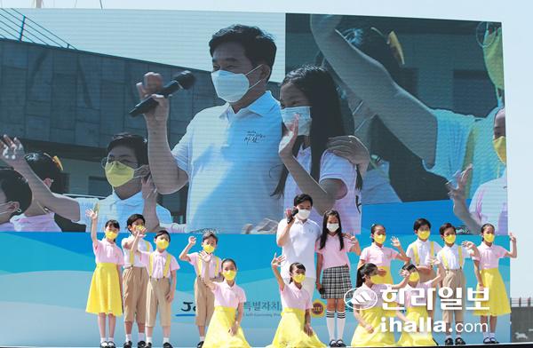제주해군기지(민군복합형 관광미항) 갈등을 빚은 서귀포시 강정마을 공동체 회복 지원 등을 담은 상생협력 협약 체결을 선언하는 기념식이 31일 강정 크루즈터미널 앞에서 열렸다.