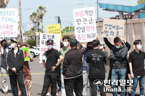 한편 제주 군사기지 저지와 평화의 섬 실현을 위한 범도민 대책위원회는 이날 "강정마을과의 진정한 상생협력은 진상규명과 책임자 처벌에서 비롯된다"면서 "각종 지원기금을 통해 발전을 이루게 해주겠다는 상생협력은 말 그대로 돈으로 상생협력을 사겠다는 것"이라고 주장하고 비판시위를 벌였다.
