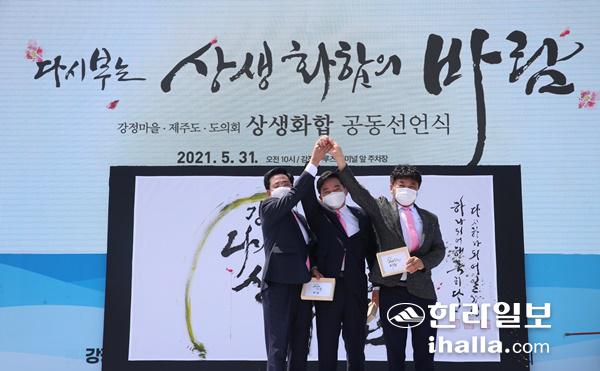 원희룡 제주지사와 좌남수 제주자치도의회의장, 강희봉 강정마을회장이 손을 맞잡고 '상생 화합'을 선언했다.