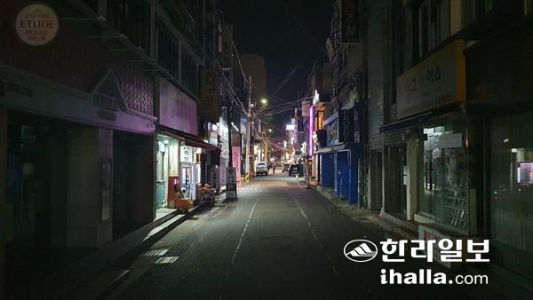 지난달 31일 영업제한으로 인해 한산한 모습을 보이고 있는 제주시청 대학로.