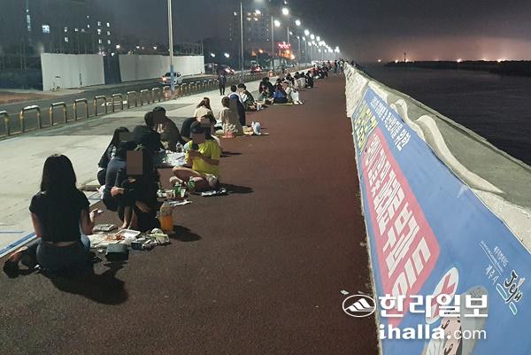 사회적 거리두기 2단계 격상 첫날인 지난달 31일 밤 11시쯤 제주시 건입동 탑동광장 인근에서 많은 사람들이 노상을 즐기고 있다. 강민성기자
