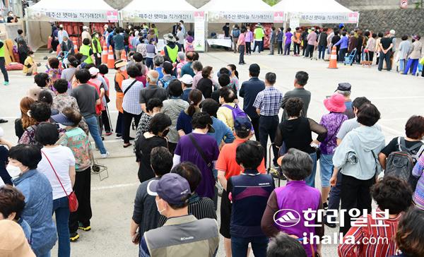3일 오전 농협본부 야외주차장에 마련한 직거래장터에는 일찍부터 마늘을 구입하려는 시민들이 몰려들어 긴 줄이 만들어졌다. 강희만기자