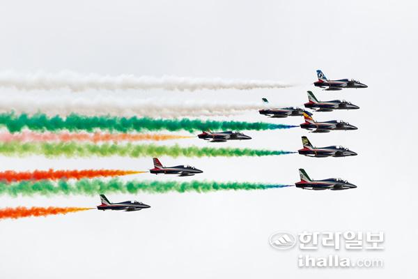 이탈리아의 공화국 선포기념일인 2일(현지시간) 공군 곡예비행단인 '프레체 트리콜로리' 소속 비행기가 로마 상공에서 국기 색깔인 적·백·녹색의 연막을 내뿜으며 날고 있다.[연합뉴스]