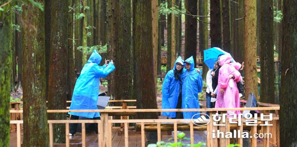 3일 사려니숲을 찾은 관광객들이 사진 촬영을 하며 즐거운 시간을 보내고 있다.