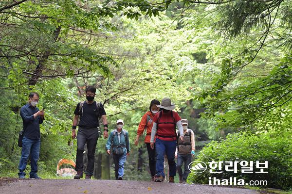 4일 '2021 제주산림문화체험 사려니숲 에코힐링 체험 행사' 참가자들이 자연을 만끽하며 사려니숲길을 걷고 있다. 사진=강희만기자