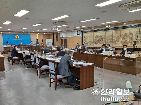 제주특별자치도의회 예산결산특별위원회가 4일 회의를 진행 중인 가운데 다수 의원석이 비어 있다.