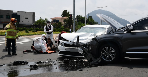 5일 오후 1시42분쯤 서귀포시 안덕면 일주서로 교차로에서 렌터카 2대가 충돌하며 중경상자 8명이 발생했다. 강희만기자