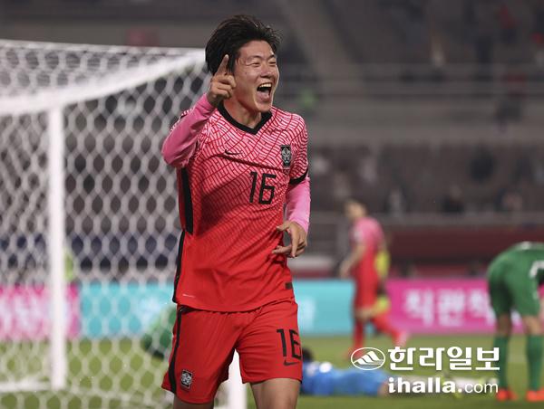5일 오후 고양종합운동장에서 열린 카타르 월드컵 2차 예선 대한민국 대 투르크메니스탄 경기. 대한민국 황의조가 추가골을 넣은 후 기뻐하고 있다. 연합뉴스