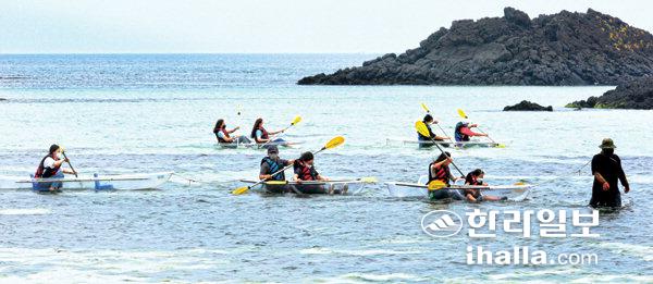 3일 제주시 구좌읍 월정리를 찾은 관광객들이 투명 카약을 타며 즐거운 시간을 보내고 있다. 이상국기자
