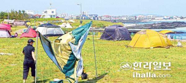 본격적인 피서철을 앞둔 가운데 7일 제주시 구좌읍 김녕해수욕장 야영장에 야영객들이 텐트를 치며 여유로운 시간을 보내고 있다. 이상국기자