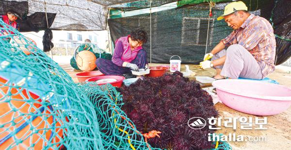 8일 제주시 한림읍 수원리에서 해녀들이 갓 잡아온 성게를 어민들이 손질을 하고 있다. 이상국기자