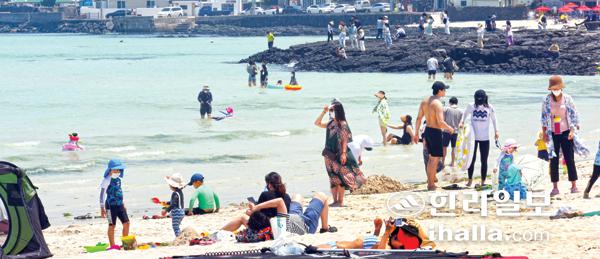 제주시 낮 최고기온이 30.5℃를 기록한 8일 협재해수욕장에 많은 사람들이 찾아 물놀이를 즐겼다. 이상국기자