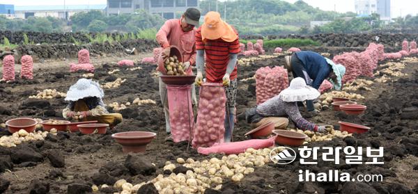 9일 제주시 구좌읍 평대리의 한 밭에서 농민들이 감자 수확 작업으로 분주한 시간을 보내고 있다. 이상국기자