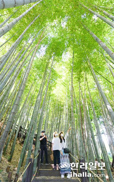 9일 제주시 연동 한라수목원 대나무숲을 찾은 관광객들이 대나무숲 그늘에서 더위를 피하며 기념사진을 찍고 있다. 이상국기자