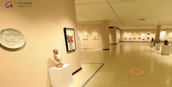 제80회 한국미술협회 제주도지회 회원전 VR 전시 투어 화면. 문예회관 1전시실에 조각, 공예, 서예 작품들이 펼쳐져 있다.