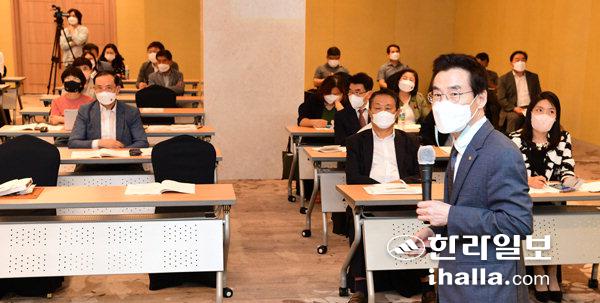 10일 제주시 호텔시리우스에서 열린 '자치분권 2.0시대 어떻게 맞을 것인가' 제주권 대토론회에서 김중석 대통령 소속 자치분권위원회 자치제도분권위원장이 발제를 하고 있다. 강희만기자