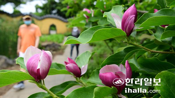 10일 서귀포시 정방동 서복불로초공원에 때 아닌 자목련꽃이 개화해 행인들의 눈길을 끌고 있다. 목련꽃은 보통 추위가 끝나는 3월말이나 4월 초순을 즈음해 개화한다. 강희만기자