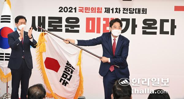 국민의힘 이준석 새 대표가 11일 서울 여의도 중앙당사에서 열린 전당대회에서 당기를 흔들고 있다. 연합뉴스